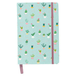 - Zápisník je v mentolové barvě s potiskem kaktusů.